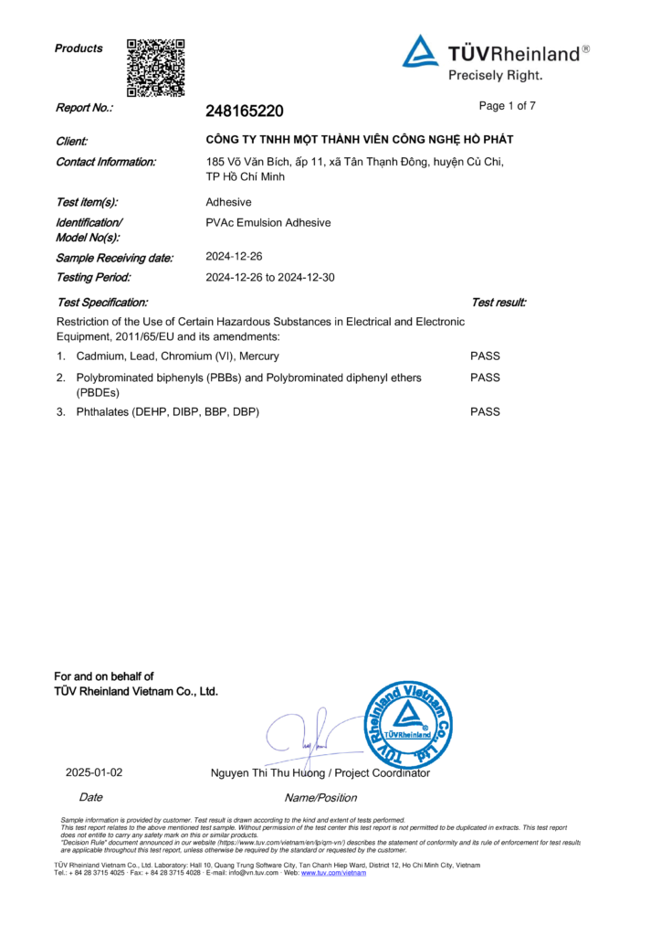 Bên cạnh đó Hồ Phát còn đạt được chứng nhận theo tiêu chuẩn REACH & RoHS, với sự giám sát liên tục nhu cầu của khách hàng, đảm bảo chất lượng sản phẩm và độ ổn định sản xuất cao.